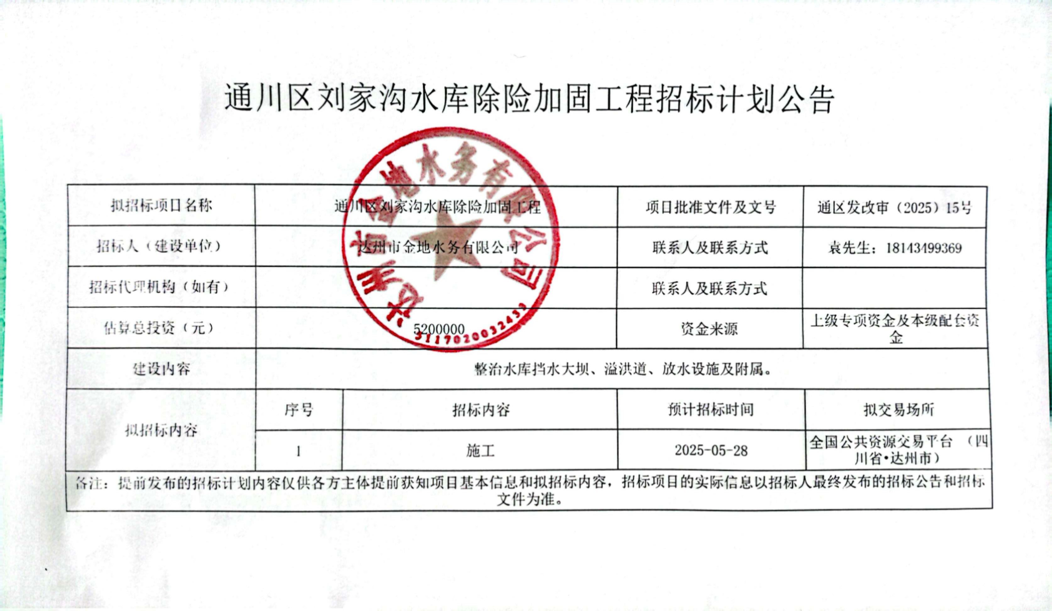 | 拟招标项目名称 | 通川区刘家沟水库除险加固工程 | 项目批准文件及文号 | 通区发改审(2025)15号 | ||||||